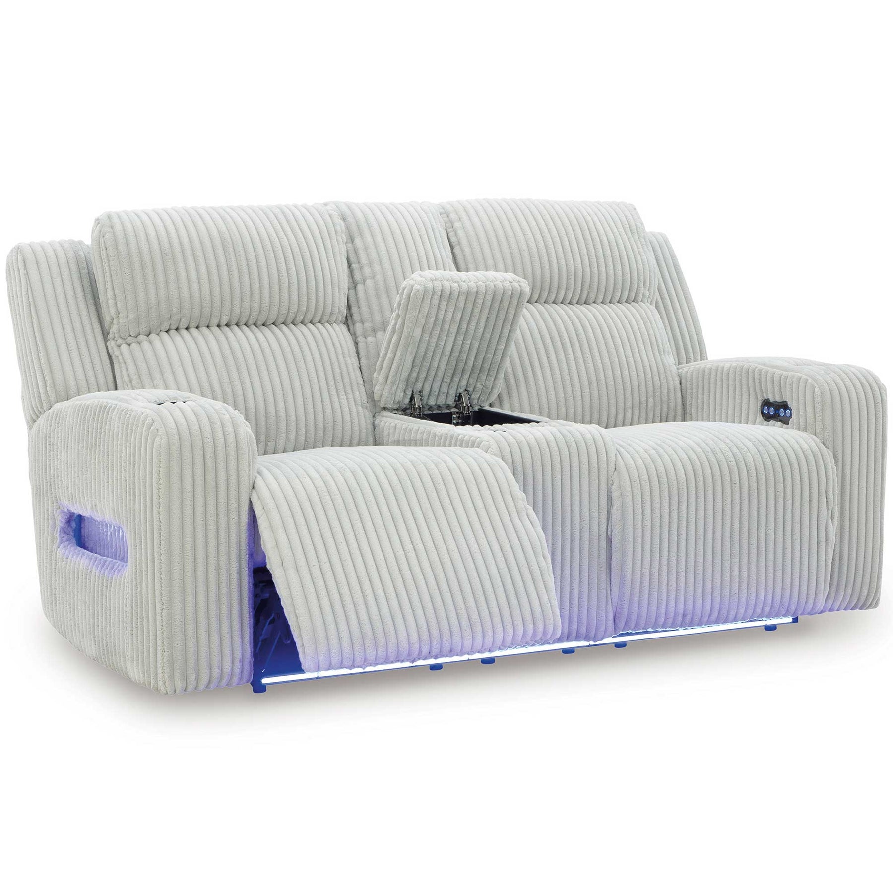 - Drop-down table with LED reading lights, USB (A & C) charging, and cup holders (sofa)