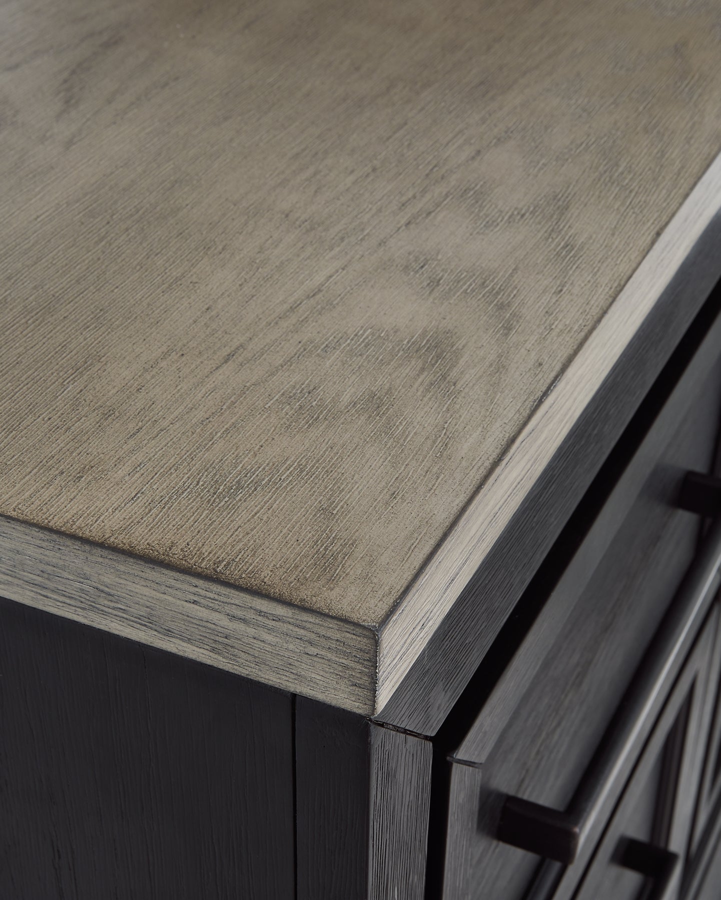 Details B989B4: Includes king panel headboard, storage footboard and rails with roll slats, Made with hardwood solids, select oak veneers and engineered wood, Two-tone finish (brushed black and dusty grayish brown wood tone), Headboard with picture frame moulding, Footboard with two deep drawers, Smooth-gliding soft-close drawers with fully finished interiors and dovetail construction, Sleek drawer pulls with black finish, Bed does not require additional foundation/box spring; accommodates most zero clearance adjustable bases with the addition of a bunkie board, Mattress available, sold separately, Assembly required, B989B1: Includes dresser and mirror, Made with hardwood solids, select oak veneers and engineered wood, Two-tone finish (brushed black and dusty grayish brown wood tone), Sleek drawer pulls with black finish, 11 soft-close, smooth-gliding drawers with fully finished interiors and dovetail construction (top drawers felt lined), 5 drawers with brushed black finish; 6 drawers with grayish brown wood tone, 3 drawers located behind each door, Mirror mounts to back of dresser, Assembly required, B989-48: Made with hardwood solids, select oak veneers and engineered wood, Two-tone finish (brushed black and dusty grayish brown wood tone), Sleek drawer pulls with black finish, 5 soft-close, smooth-gliding drawers with fully finished interiors and dovetail construction (top drawers felt lined), 3 pull-out trays (felt lined) and 2 adjustable shelves behind door, B989-92: Made with hardwood solids, select oak veneers and engineered wood, Two-tone finish (brushed black and dusty grayish brown wood tone), Sleek drawer pulls with black finish, 2 soft-close, smooth-gliding drawers with fully finished interiors and dovetail construction, 110V power supply with dual USB charging port, Power cord included; UL listed,
