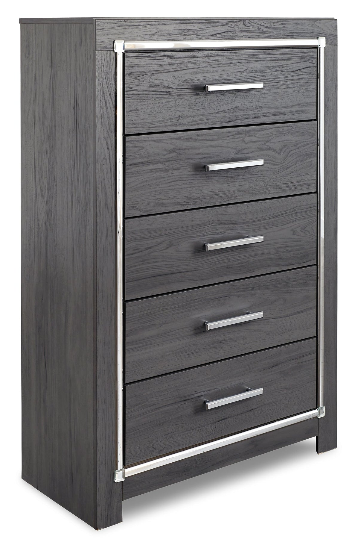 Details B214-46: Made of engineered wood (MDF/particleboard) and decorative laminate, Gray finish with replicated wood grain, Faceted chrome-tone pulls and accents, 5 smooth-operating drawers, Drawer interiors are lined with a faux linen laminate for a clean, finished look, Safety is a top priority, clothing storage units are designed to meet the most current standard for stability, ASTM F 2057 (ASTM International), Drawers extend out to accommodate maximum access to drawer interior while maintaining safety, B214-58: Made of engineered wood (MDF/particleboard) and decorative laminate, Gray finish with replicated wood grain, Faux leather upholstery, Faux crystal and faceted chrome-tone metal accents, Accent LED lights with remote to control color and brightness, Included remote holder keeps remote for lights discreet and accessible, Hardware not included, ¼" bolts are needed to attach headboard to existing metal bed frame, Capable of attaching to a full sized metal bolt-on bedframe, Power cord included; UL Listed, Mattress and foundation/box spring available, sold separately, Assembly required, B214-92: Made of engineered wood (MDF/particleboard) and decorative laminate, Gray finish with replicated wood grain, Faceted chrome-tone pulls and accents, 2 smooth-operating drawers, Drawer interiors are lined with a faux linen laminate for a clean, finished look, USB and wireless charging options, Power cord included; UL Listed, Assembly required, B214B1: Made of engineered wood (MDF/particleboard) and decorative laminate, Gray finish with replicated wood grain, Faceted chrome-tone pulls and accents, 6 smooth-operating drawers, Drawers lined with faux linen laminate, Mirror attaches to back of dresser, Includes tipover restraint device, Assembly required,