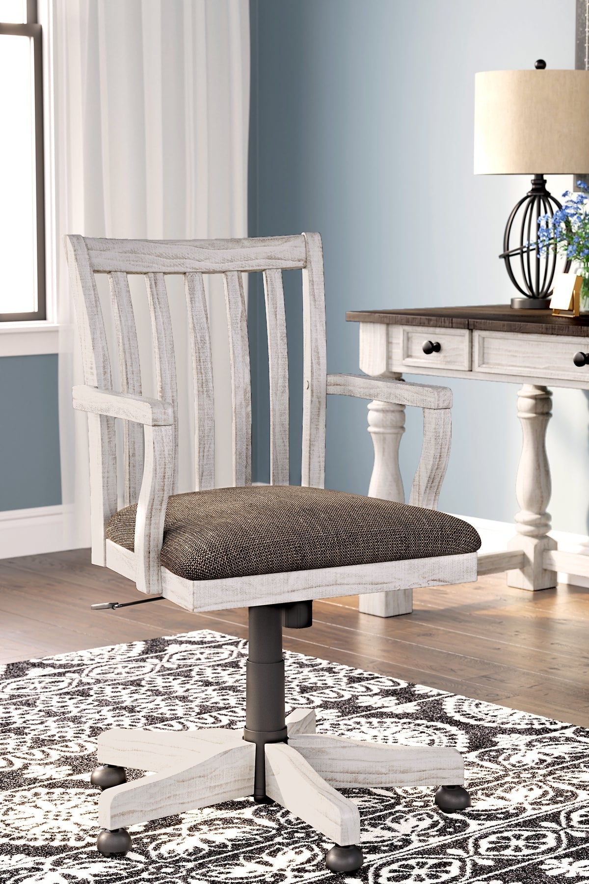Details | Made of wood, Vintage white finish, Foam-cushioned seat with polyester oatmeal-colored fabric, Swivel motion, Casters for mobility, Slat back design, Assembly required | |