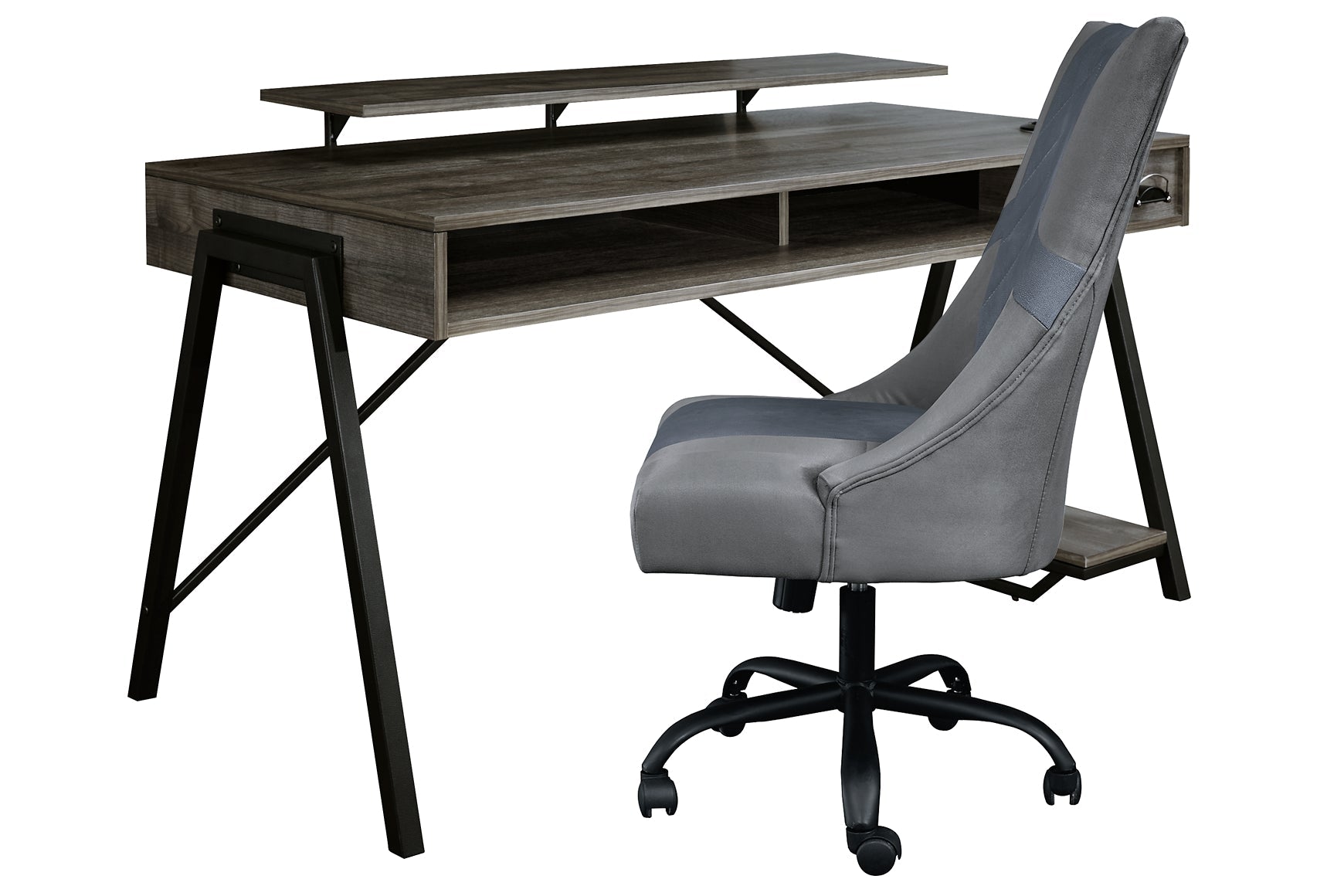 Details | Includes gaming desk and gaming swivel chair, Desk with metal frame and silvertone finish, Open raceway for power cord management; LED backlight with multiple color options (includes remote control); PC stand; open storage cubby, Dual USB charging port, Chair with foam cushioned seat, Adjustable seat height; tilting mechanism; 360-degree swivel; casters for easy movement, Assembly required | |