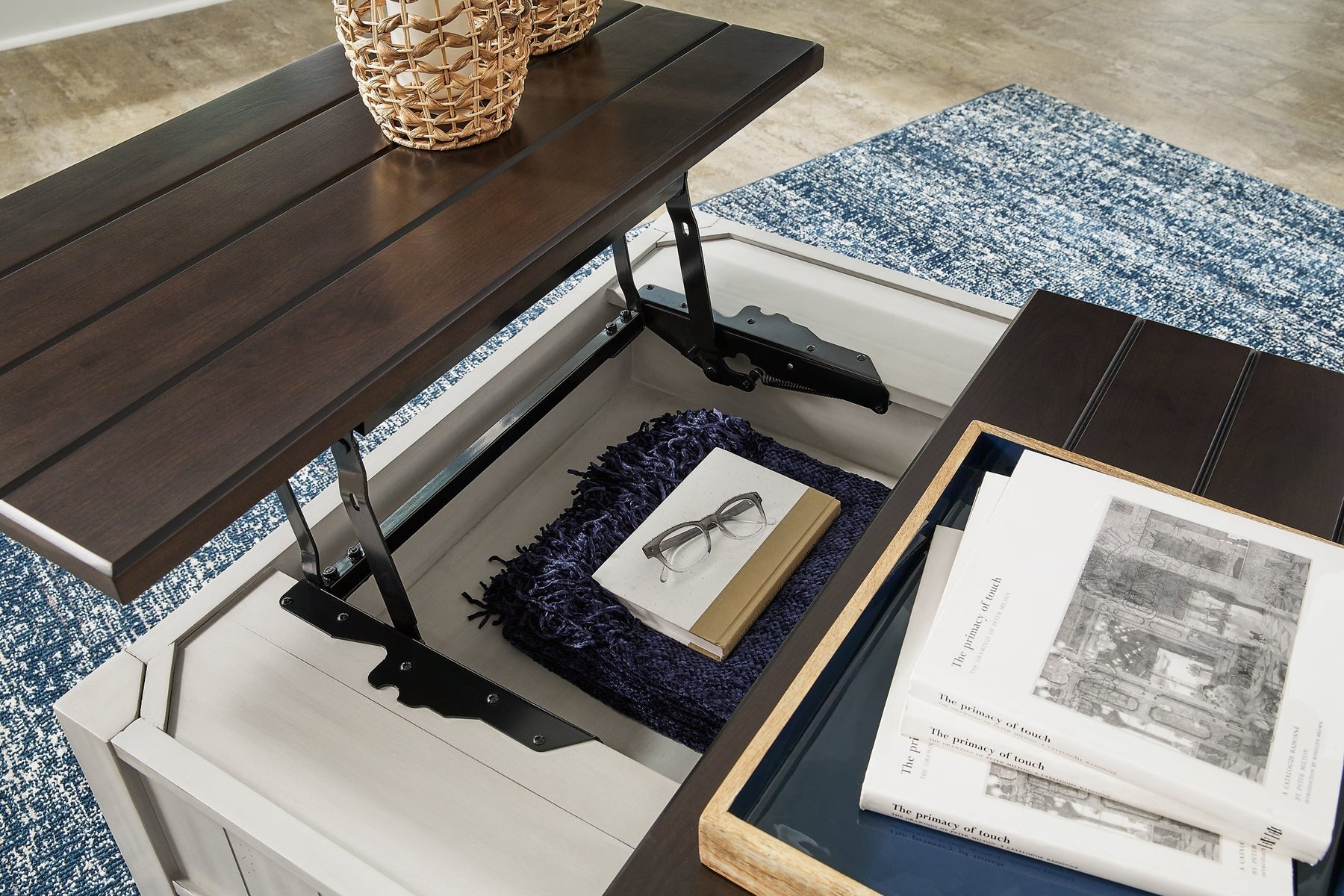 | Details | Made with solid acacia wood, cherry veneer and MDF substrate, Glazed light gray painted finish with brown cherry-stained top, 2 drawers with fully finished interiors and metal ball-bearing side glides, Metal bar pulls with aged iron-tone finish, Subtle handmade distressing marks for added character and charm, Open lower shelf, Casters for easy mobility, Tabletop with planked wood effect, Split hinged lift top, Assembly required | |