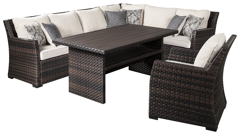 Details | Includes 2-piece sectional with cushions, 2 lounge chairs with cushions and multi-use table, All-weather resin wicker handwoven over rust-free aluminum frames, Powder coated aluminum resists rusting and fading, Multi-use table with aluminum top; lower shelf, Zippered cushions covered in high-performing Nuvella® fabric, All-weather foam cushion core wrapped in soft polyester, 6 throw pillows included, Clean fabric with mild soap and water, let air dry; for stubborn stains, use a solution of 1 cup bleach to 1 gallon water, Imported fabric and fill, Assembly required | |