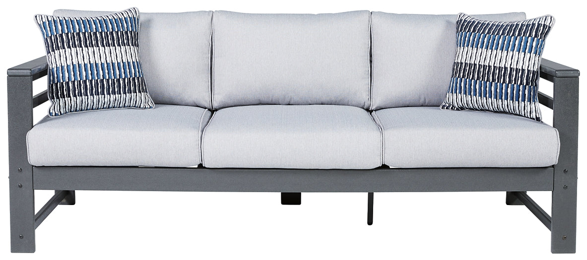 Details | Includes sofa with cushions, Made of durable and sturdy HDPE material, MEGA TUFF™ HDPE surfaces are made of high-density polyethylene, which gives the wood look you love and the weather resistance you crave, Stainless steel hardware, Designed to withstand the harsh elements of the outdoors, Charcoal gray frame, Easy-clean polyester (Nuvella®) upholstery remains vibrant and resists stains, All-weather foam cushion core wrapped in soft polyester, Clean fabric with mild soap and water, let air dry; for stubborn stains, use a solution of 1 cup bleach to 1 gallon water, 2 throw pillows included, Imported fabric and fill, Assembly required | |