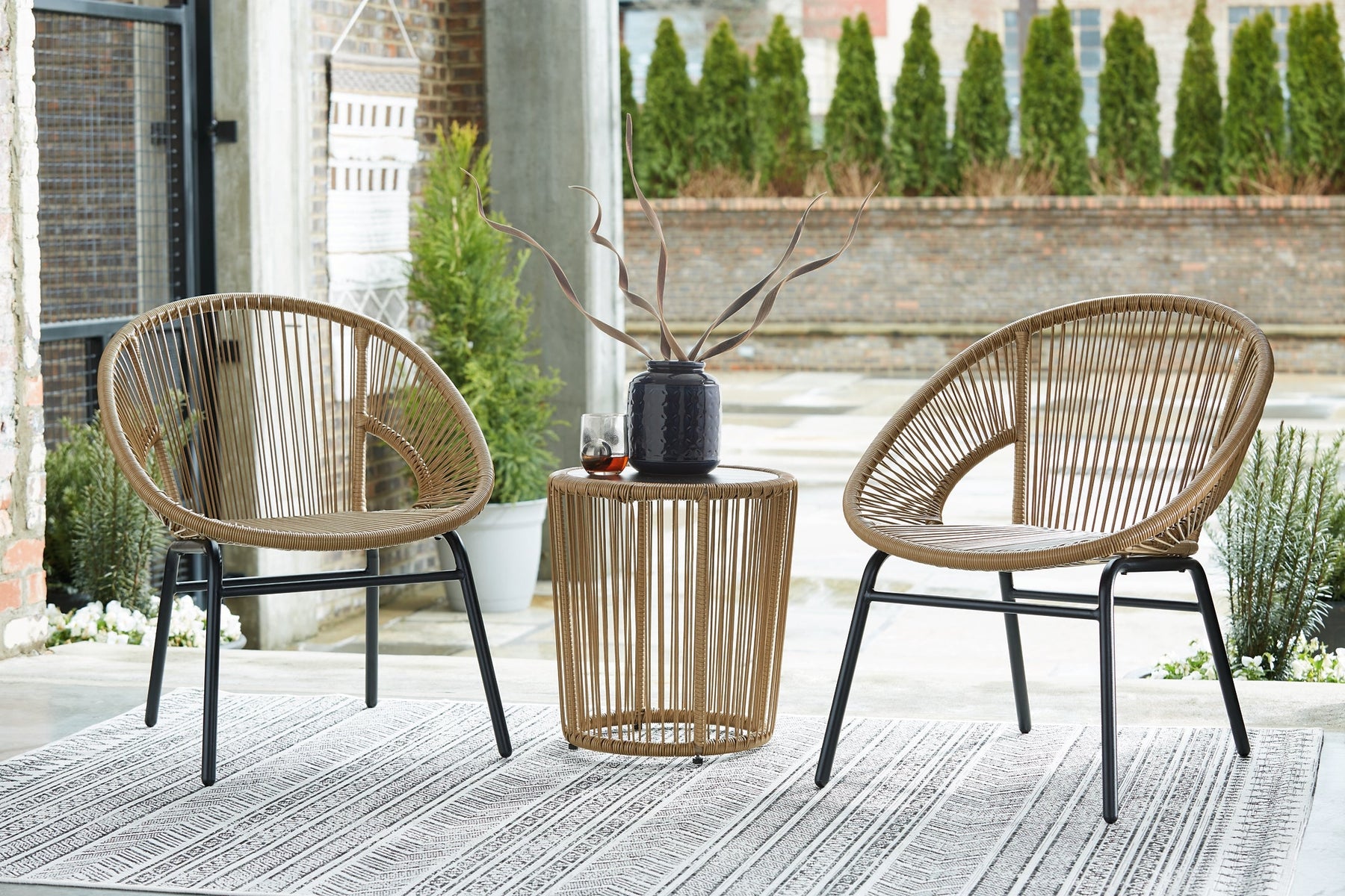 Treat yourself to trend-right outdoor design with this table and chair set. It elevates your patio, deck or poolside seating area with brown resin wicker over a durable powder coated steel frame. The included end table with an aluminum top keeps your essentials for everyday relaxation within reach.