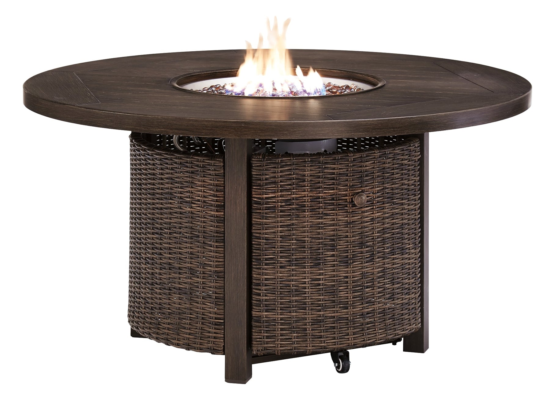 Details | Includes sofa with cushions, 2 swivel lounge chairs and round fire pit table, All-weather, handwoven resin wicker over rust-free aluminum frame, Wood-like finish on sofa and chair armrests, chair base and fire pit top, 48" round fire pit with CSA-approved 55,000 BTU stainless steel burner, glass beads, burner cover and protective all-weather cover, Seat cushions and pillows covered with high-performance Nuvella® fabric; all-weather foam cushion core wrapped in soft polyester, Fire pit convertible to natural gas; door conceals gas propane tank (not included), Fire pit features battery-operated ignition system with adjustable flame control; battery included, Chair with 360-degree swivel, Clean fabric with mild soap and water, let air dry; for stubborn stains, use a solution of 1 cup bleach to 1 gallon water, Throw pillows included, Imported fabric and fill, Assembly of fire pit table provided with in-home delivery; connection to propane tank or connector hose not provided, Assembly required | |