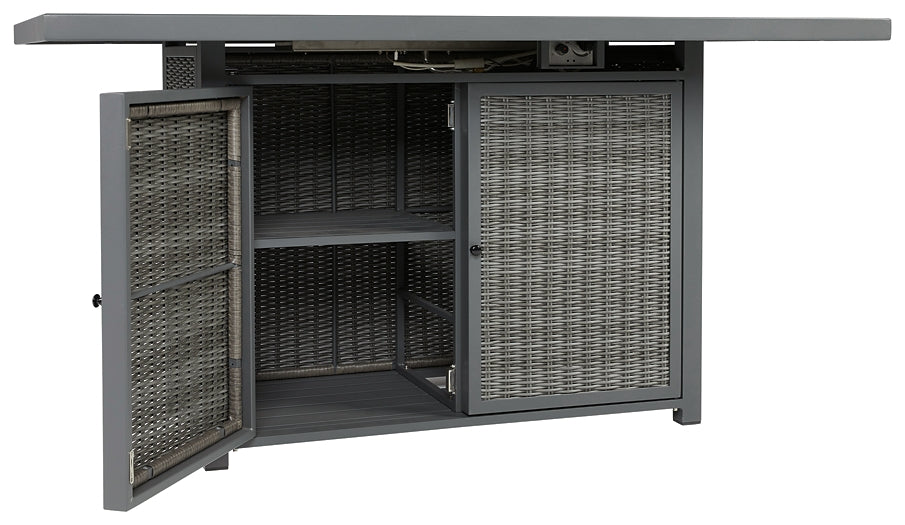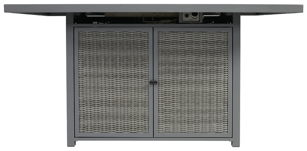 Details | Includes gas fire pit table with CSA-approved 30,000 BTU stainless steel burner, glass beads, burner cover and all-weather protective cover, Made with all-weather resin wicker, Aluminum frame, Stainless steel hardware, Battery-operated ignition system with adjustable flame control; battery included, Double cabinet doors conceal gas propane tank (not included) and 2 shelves, Convertible to natural gas, Gas line or propane tank connector hose not provided, Assembly required | |