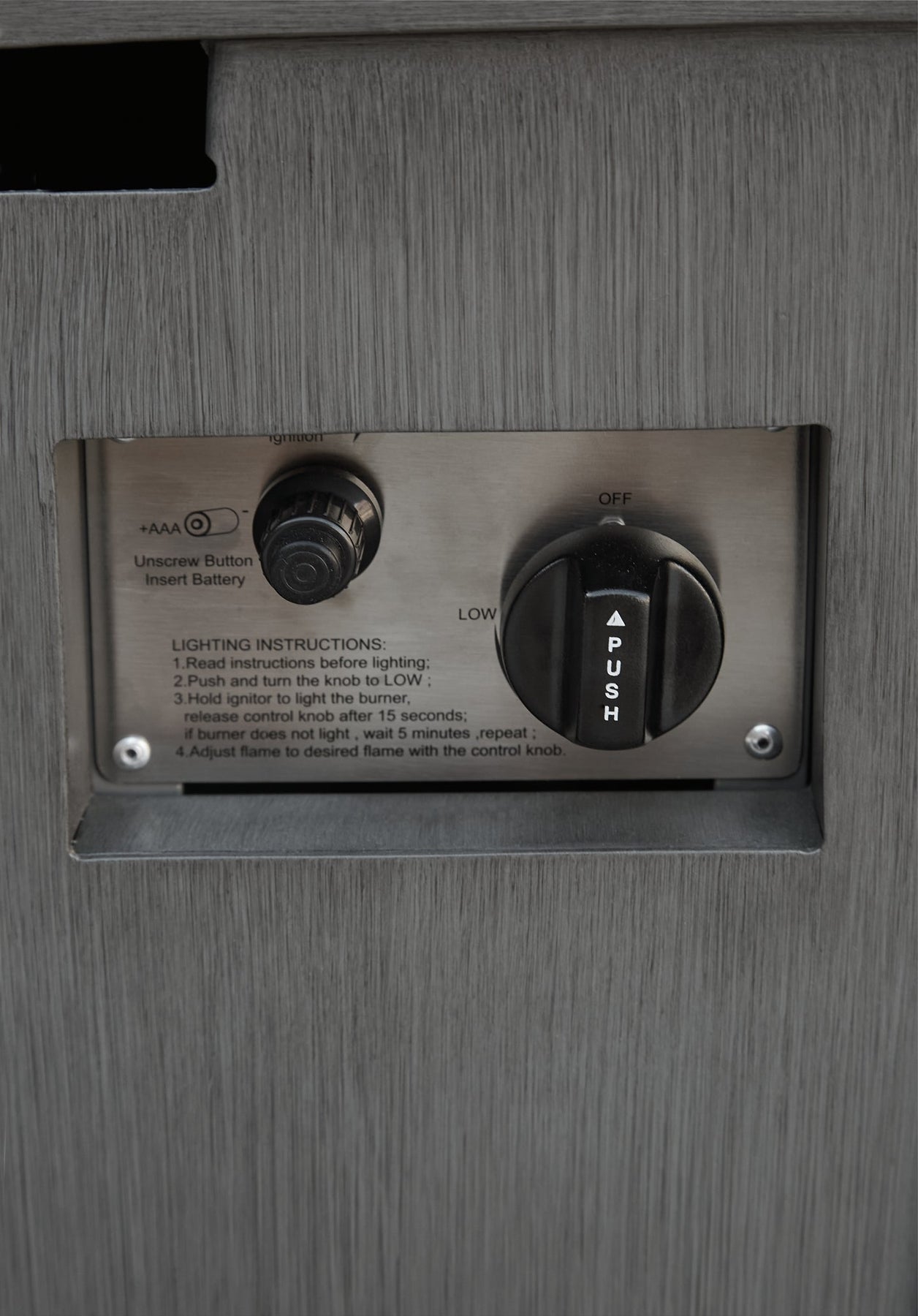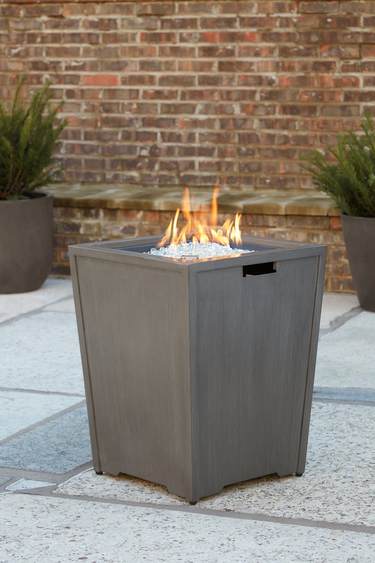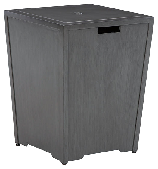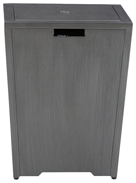 Details Rectangular gas fire pit table with CSA-approved 47,000 BTU burner, glass beads, burner cover and all-weather polyester cover, Rust-resistant aluminum frame, Hand-applied multi-step paint finish, Stainless steel hardware, Battery-operated ignition system with adjustable flame control; battery included, Side door conceals gas propane tank (not included), Convertible to natural gas, Designed to withstand the harsh elements of the outdoors, No assembly required