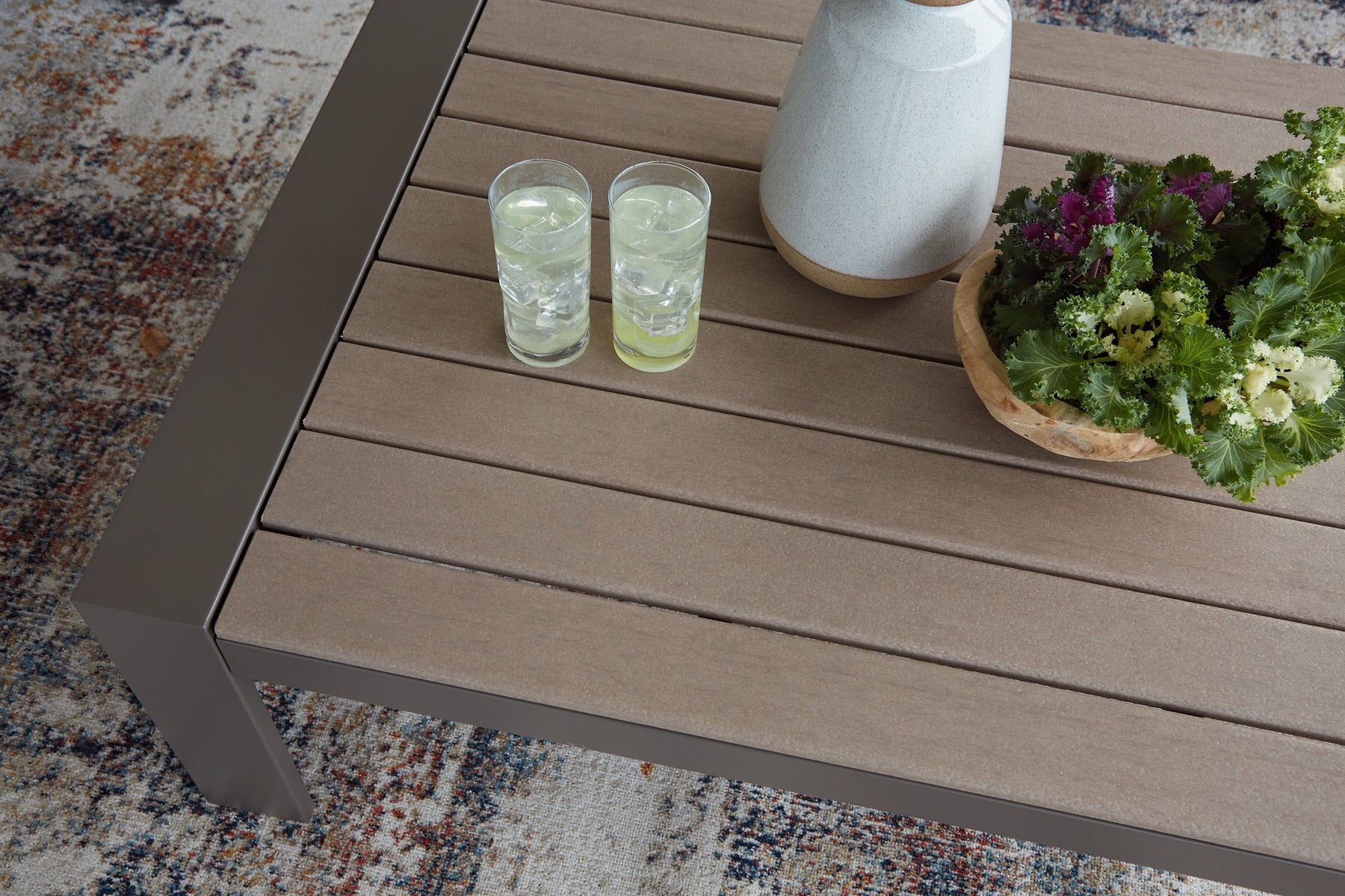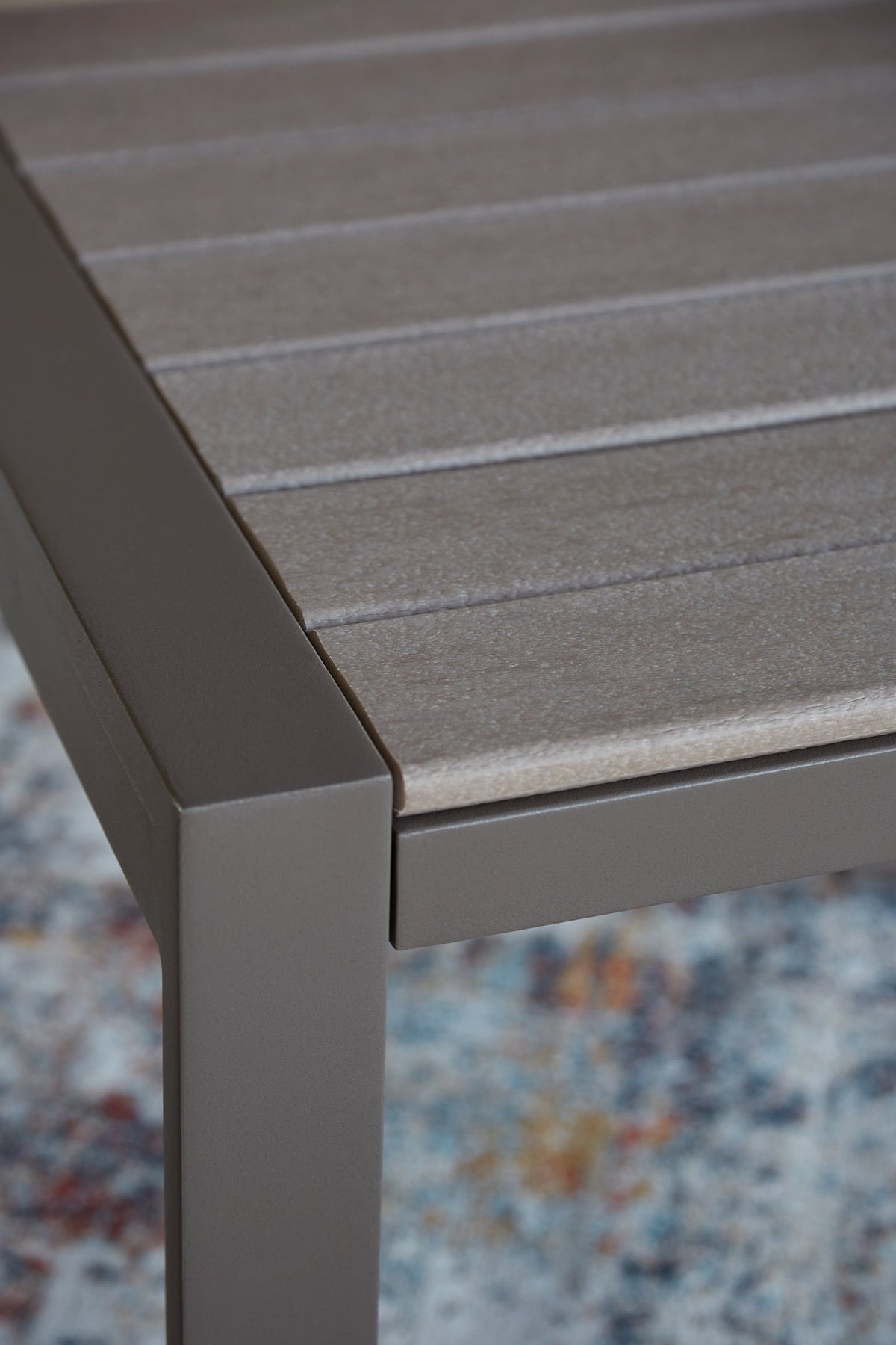 Details | All-weather, rust-proof aluminum frame, Tabletop made with MEGA TUFF™ HDPE material, Stainless steel hardware, Taupe color frame; driftwood color slats, MEGA TUFF™ HDPE surfaces are made of high-density polyethylene, which gives the wood look you love and the weather resistance you crave, Assembly required | |