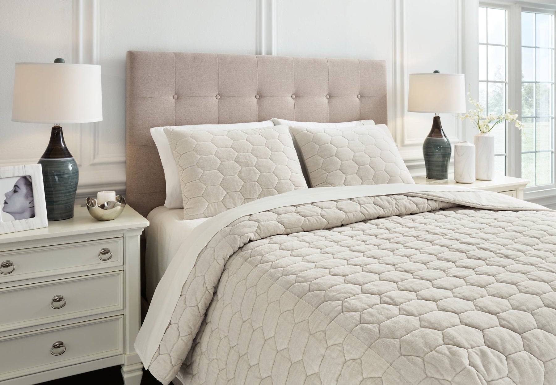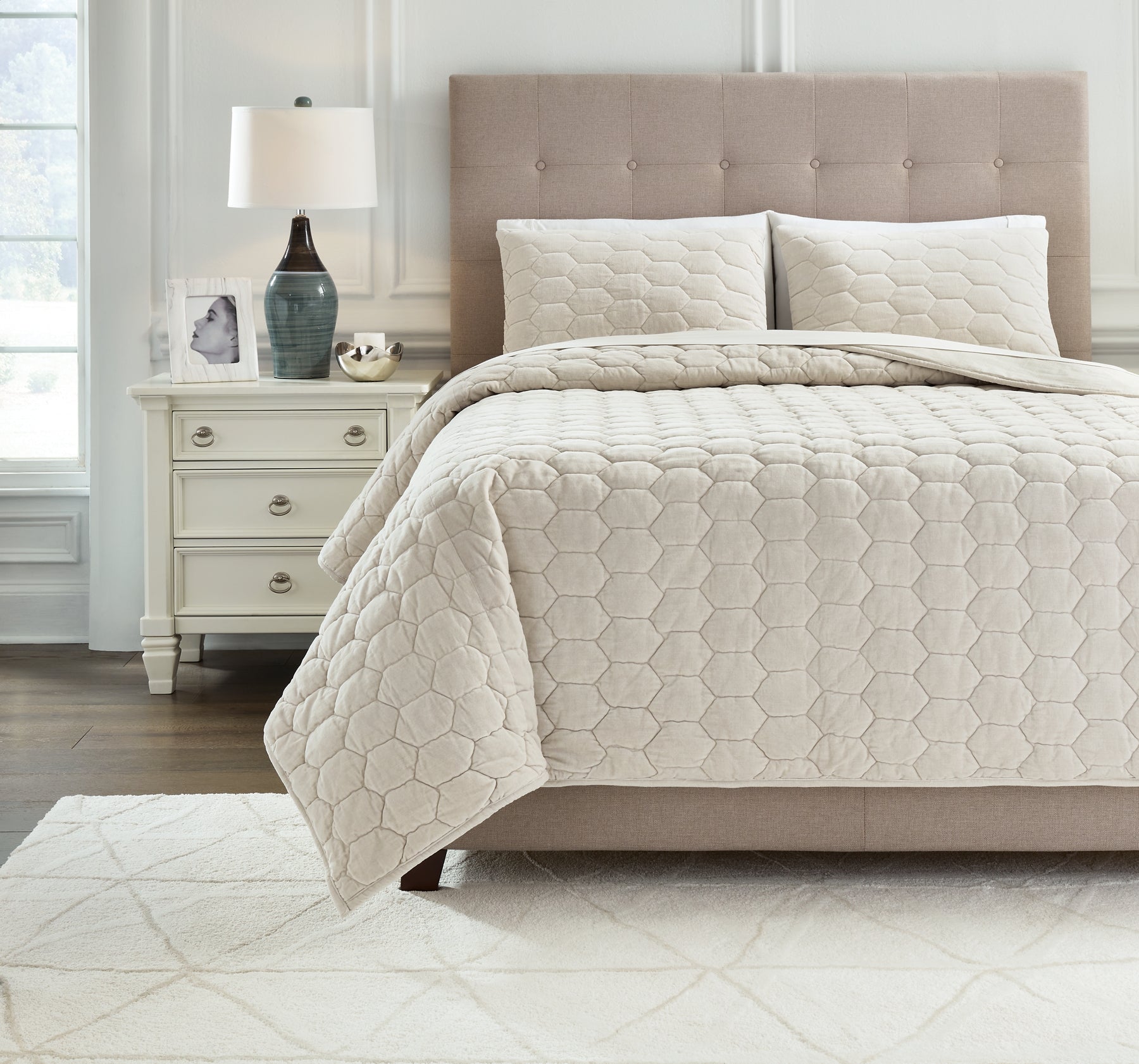 | Details | Includes queen coverlet and 2 shams, Cotton velvet front in bone color; cotton back, Stitched honeycomb design, Soft polyfill, Dry clean only, Imported | |