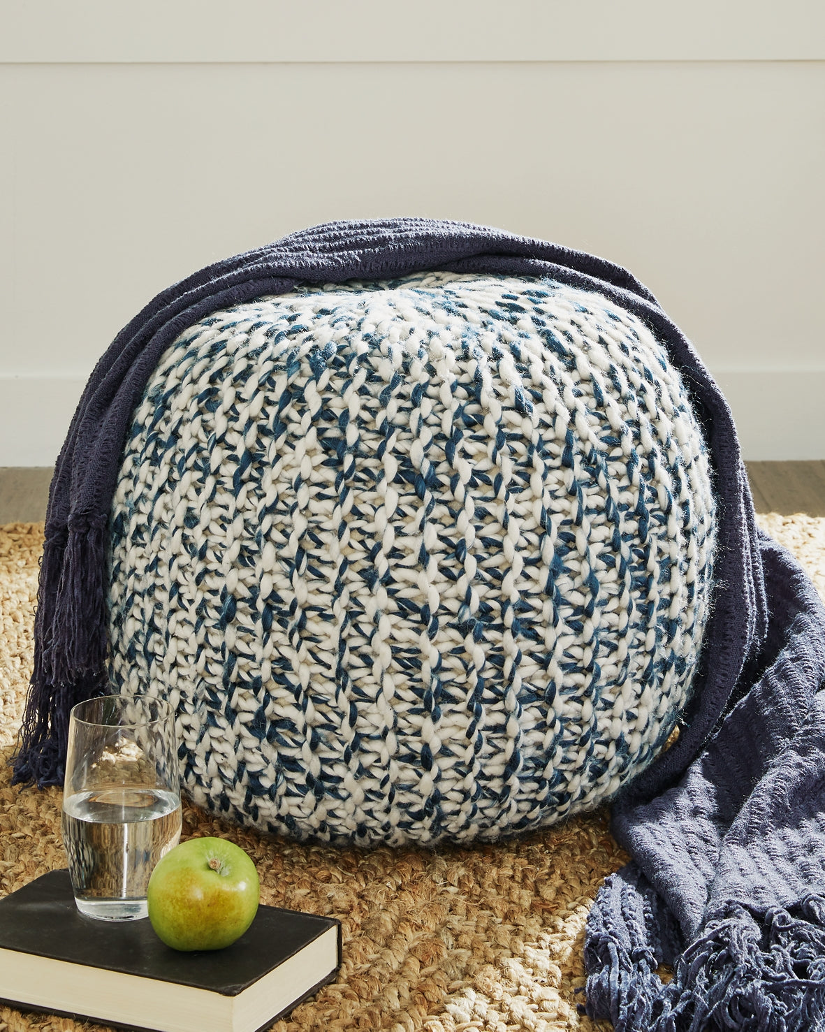 Enjoy this chunky, hand-knitted pouf in any room of your home. Perfect for putting your feet up or using as a small extra seat when you have guests. Easy to store in a corner or by the bed when not in use, this navy and white colored pouf not only looks cute but is functional too.