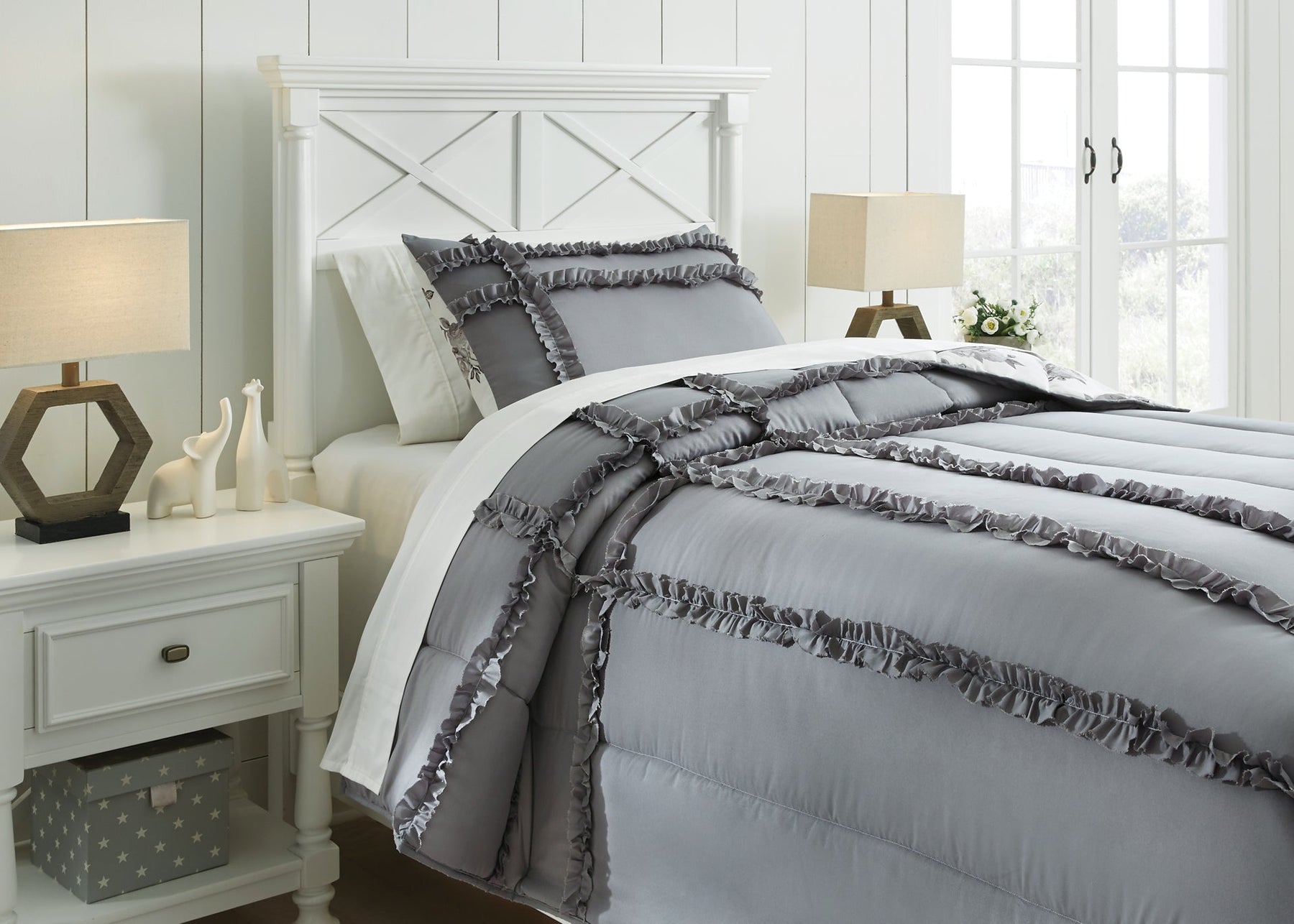 Details Set includes comforter and sham, Polyester microfiber cover with polyester filling, Reversible (solid gray over gray/white floral), Channel quilting and fringe details, Imported, Machine washable